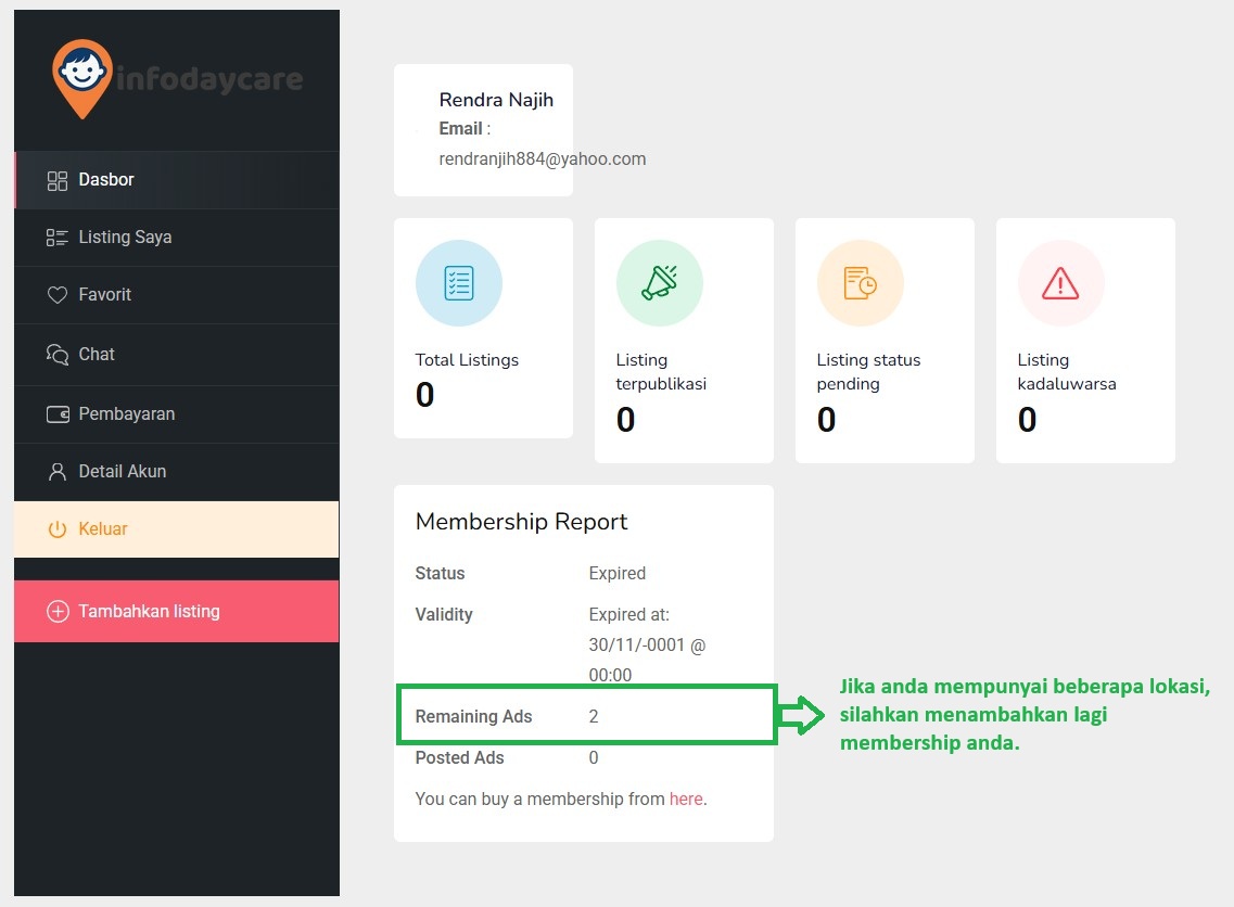 1. Dari tampilan dashboard pada halaman 'Akun Saya', maka anda akan menemukan detail dari akun anda. Termasuk jumlah slot iklan yang tersedia. Jika anda mempunyai beberapa lokasi, anda bisa menambahkan setiap lokasi dengan terlebih dahulu melakukan upgrade membership, seperti langkah awal, tanpa harus melakukan pendaftaran akun baru lagi.